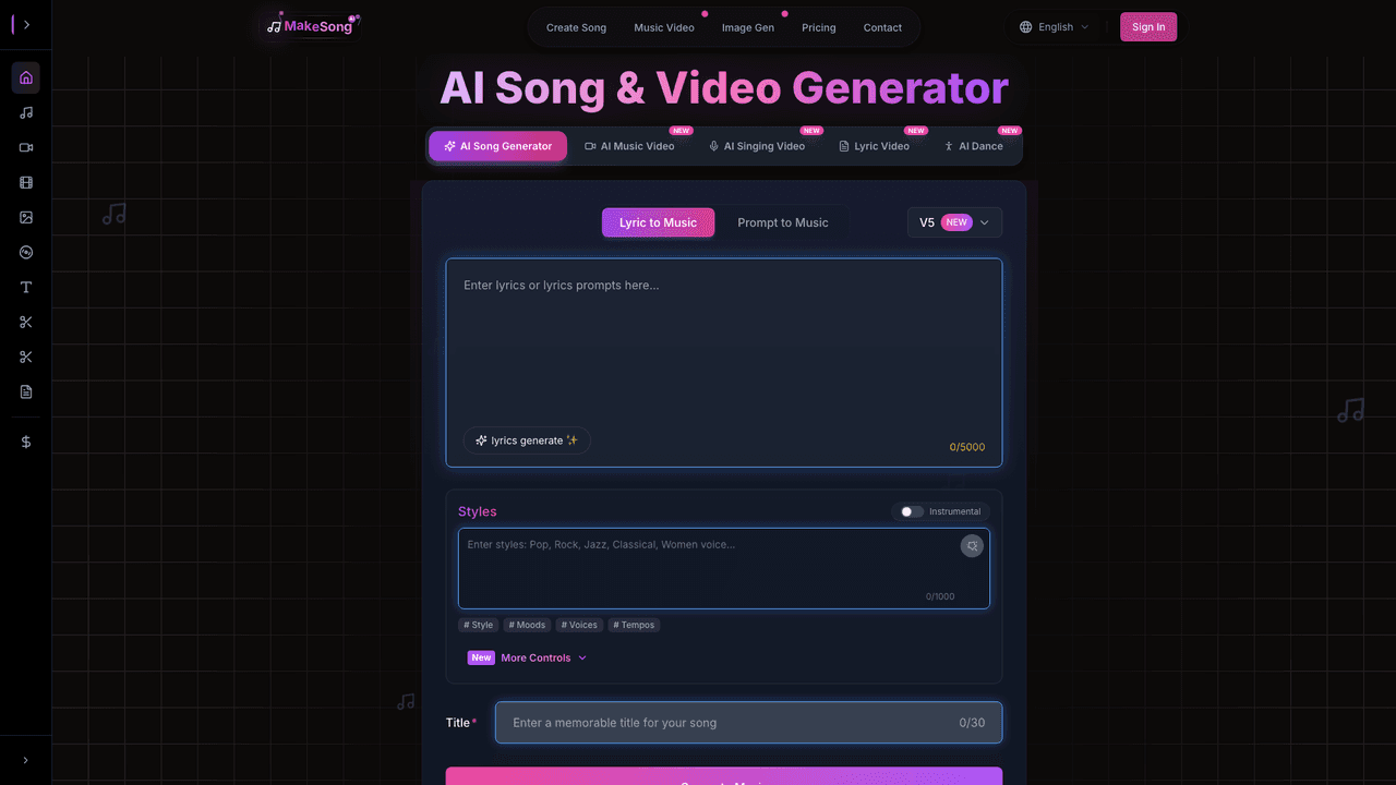 MakeSong is a smart music creation platform that allows users to transform simple ideas into complete songs within minutes. As a powerful AI Song Generator, it can automatically build melodies, rhythms, and instrument arrangements based on text prompts or lyrics provided by the user.