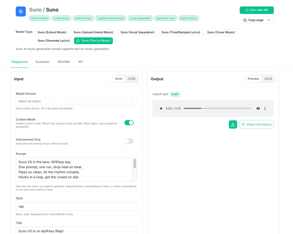 APIPASS is an API marketplace — one dashboard where you find, connect to, and manage a large number of APIs without keeping track of separate accounts. For music specifically, it gives you direct access to the Suno API, so you can wire the Suno AI Music Generator into your app — text-to-music, track extension, vocal separation, lyric generation — without dealing with provider auth or infrastructure yourself. If your project goes beyond audio (say, image generation alongside music), you can handle those integrations from the same place rather than bouncing between providers.